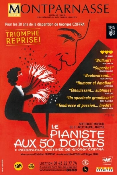 Son spectacle, « Le pianiste aux cinquante doigts » présenté au Théâtre Montparnasse est un régal, un moment de grâce qui éveille (ou élève) l’oreille, l’humour, la tendresse et l’amour. Oui, car pour bien faire il faut d’abord aimer et c’est de cet amour immodéré pour la musique, salvatrice même aux pires périodes de la vie, dont il est question.
